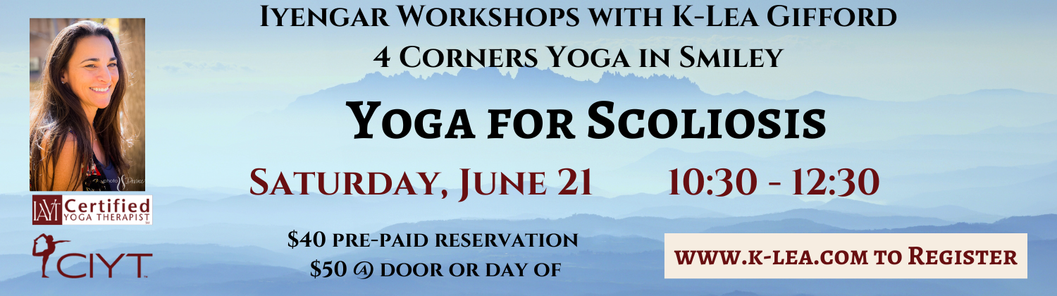 Welcome to the website for K-Lea Gifford, a Certified Iyengar Yoga Instructor, CIYT, and Certified International Yoga Therapist, IAYT, who offers private or semi-private sessions, in-person or Livestream classes and retreats. Here, you may contact K-Lea directly, get her teaching schedule, and find general information regarding her background.